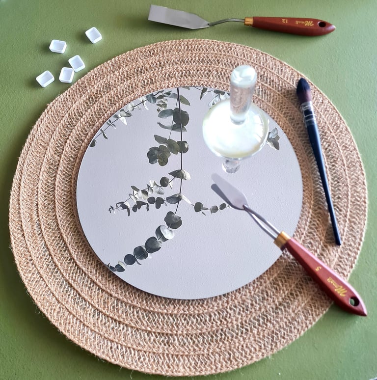 Une plaque à broyer : elle sert de support pour mélanger les pigments et le liant lors du broyage. Il faut qu'elle soit bien lisse et solide. Pour l'instant, j'utilise un miroir et c'est parfait.