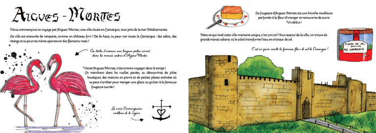 Ce sera un livre entièrement illustré à l’aquarelle, à mi-chemin entre le carnet de route et le petit guide. On y découvrira 12 villes emblématiques du sud de la France, chacune associée à une spécialité locale. L’idée, c’est de mêler découvertes historiques, culturelles, culinaires… et balades sous le soleil en famille !