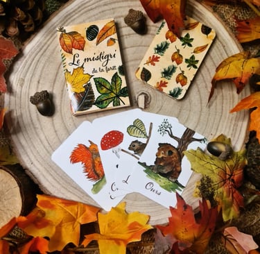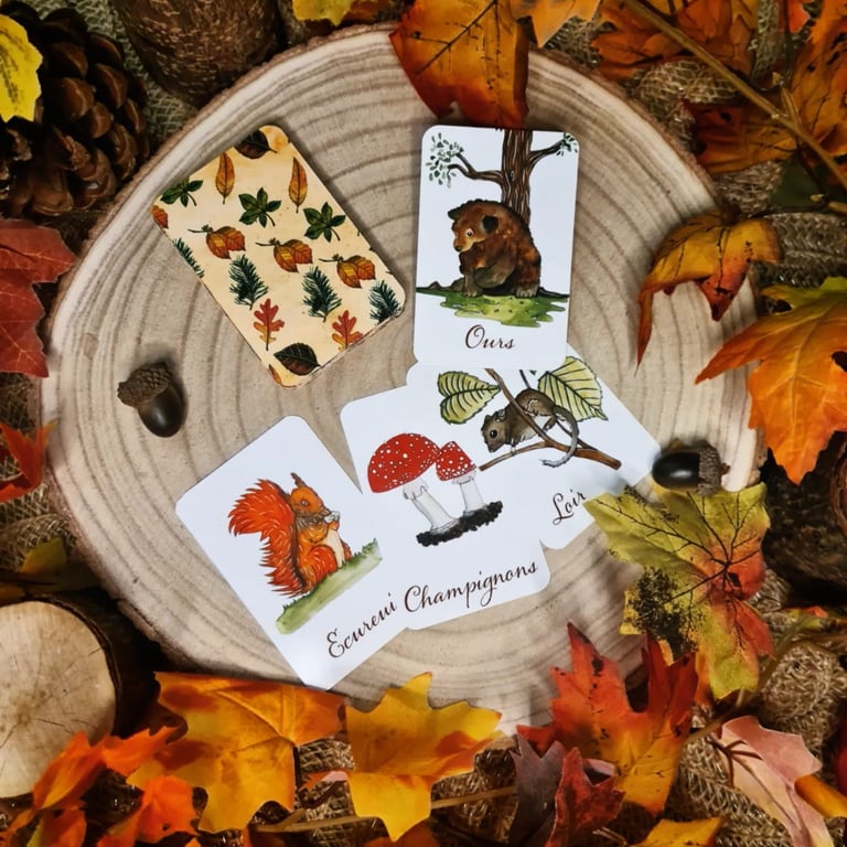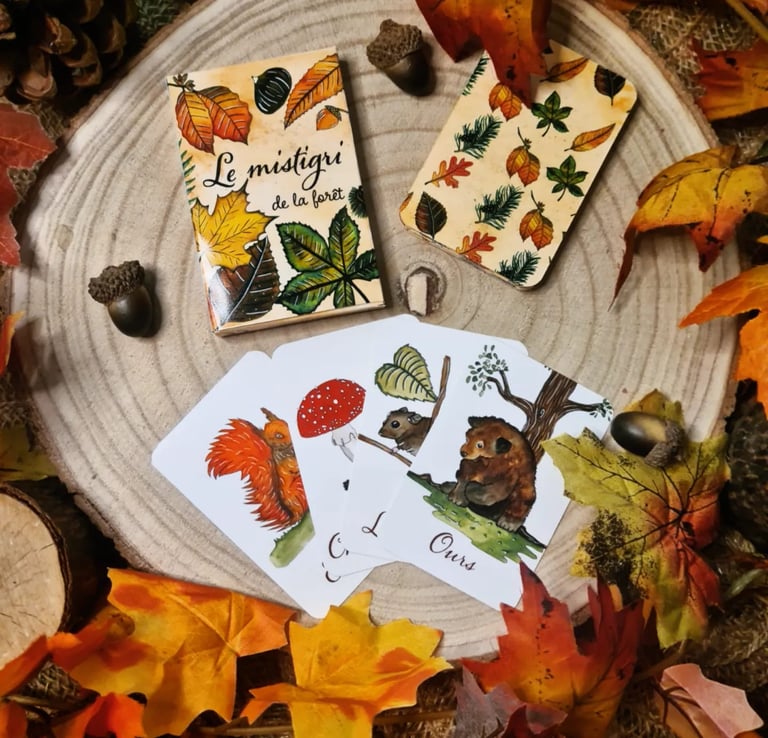 Il contient : 30 cartes "paires" des éléments de la forêt (arbre, feuille, champignons, animaux...), 1 carte règle du jeu et 1 carte du Mistigri (quelque chose qui n'a rien à faire dans la forêt !).