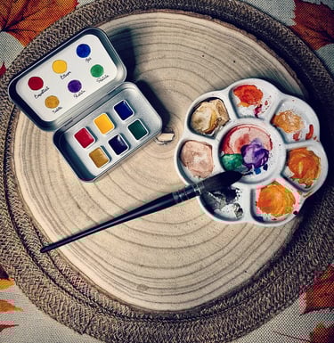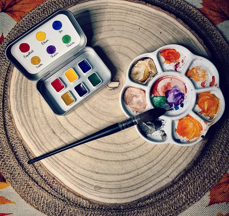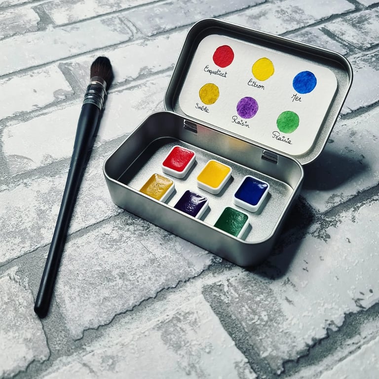 La palette est composée de 6 quarts de godets d'aquarelle artisanale avec les couleurs :