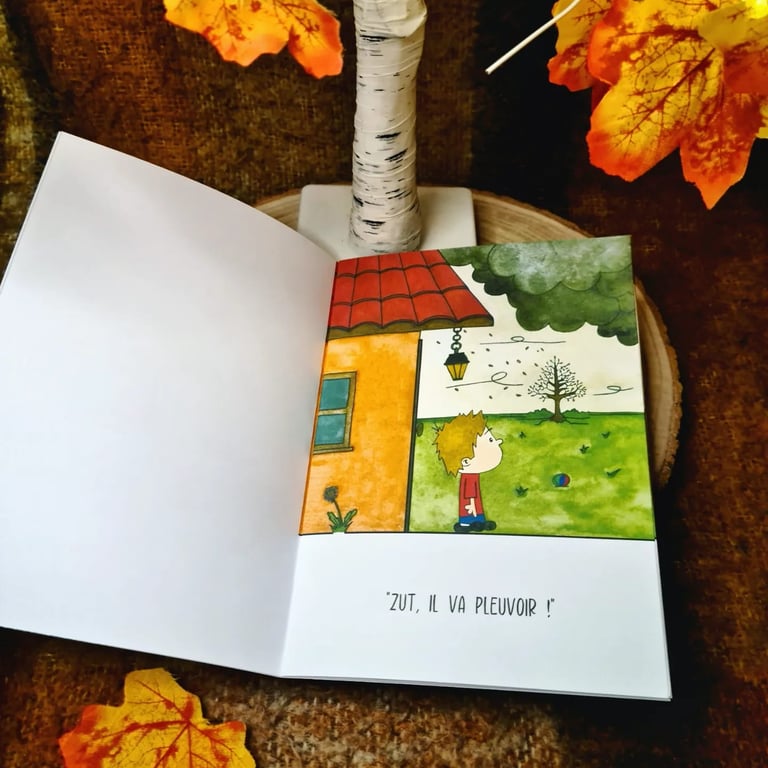 Notre livre pour enfant est entièrement réalisé par nos soins : écriture, dessins, peinture, création et impression. C'est un livre agrafé de 12 pages au format A5, la couverture est imprimé sur du papier satiné 300g et l'intérieur est imprimé sur du papier finition mat.